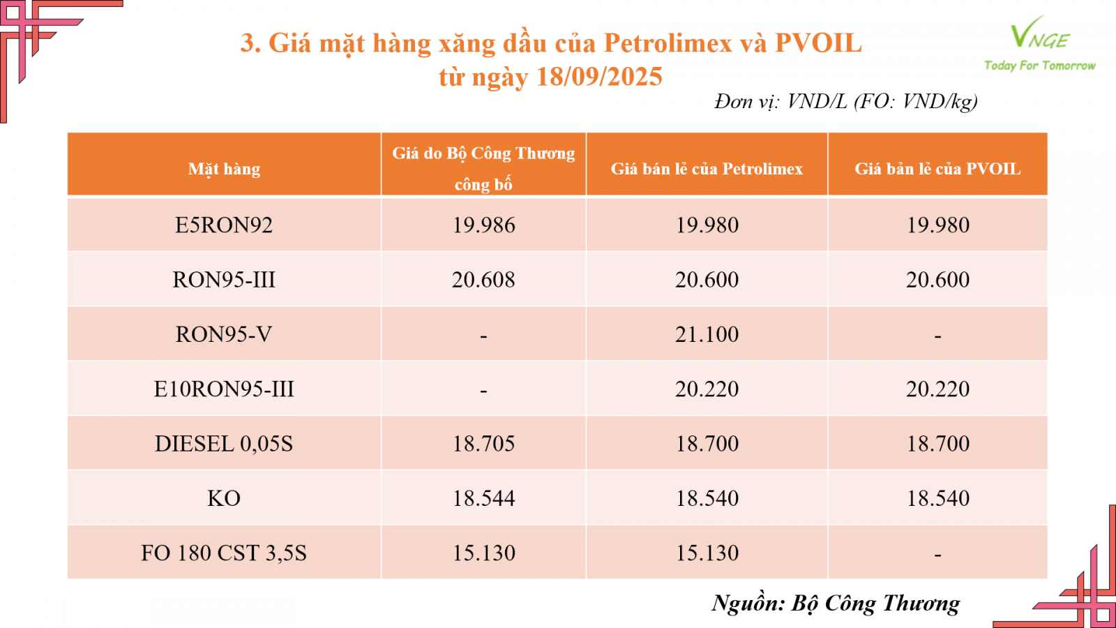 ĐIỀU CHỈNH GIÁ XĂNG DẦU NGÀY 18 THÁNG 9 NĂM 2025